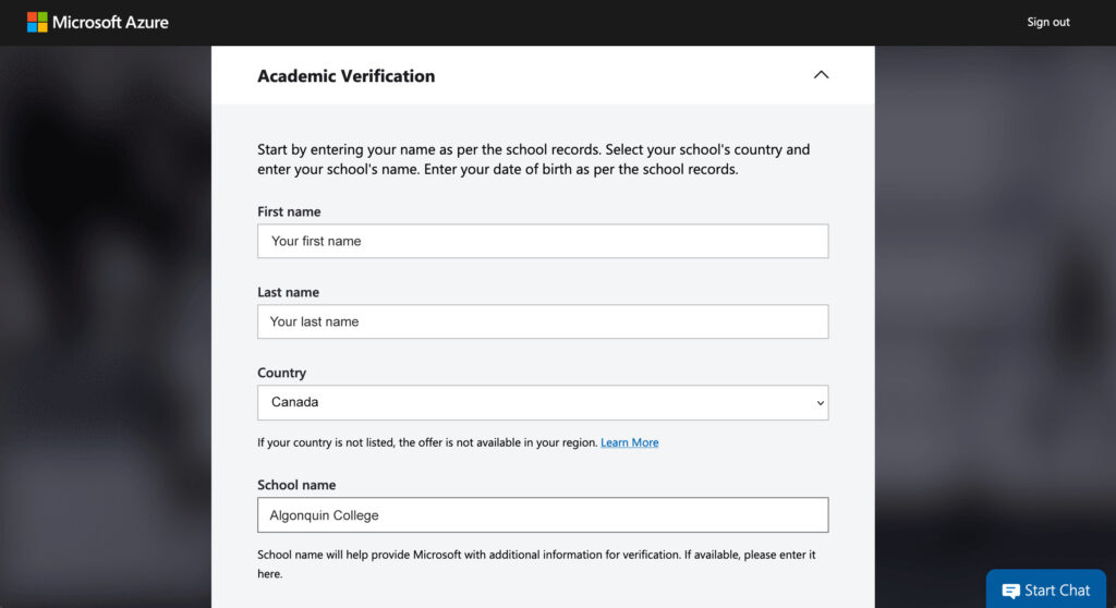 - Type in Algonquin College into the School Name