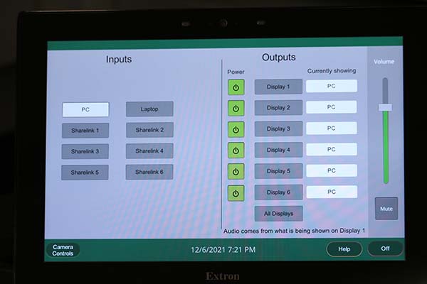 Two (2) classroom cameras. One facing the instructor desk, and the other facing the classroom. These are controlled using the Extron system (seen above). You can choose which camera to display in Zoom by changing the “Select a Camera” input device.