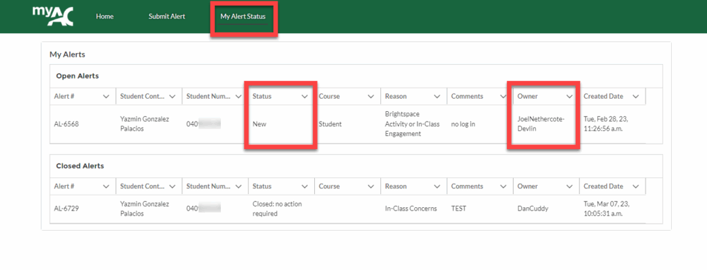 Once you have submitted an A.L.E.R.T., you may want to check to see that it was submitted correctly and that the Student Success Specialist (SSS) has acknowledged the submission. You can see this information within the A.L.E.R.T system using the following process: