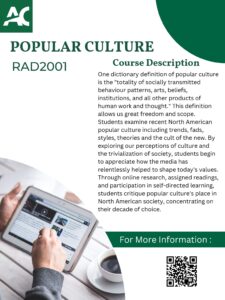 One dictionary definition of popular culture is the “totality of socially transmitted behaviour patterns, arts, beliefs, institutions, and all other products of human work and thought.” This definition allows us great freedom and scope. Students examine recent North American popular culture including trends, fads, styles, theories and the cult of the new. By exploring our perceptions of culture and the trivialization of society, students begin to appreciate how the media has relentlessly helped to shape today’s values. Through online research, assigned readings, and participation in self-directed learning, students critique popular culture’s place in North American society, concentrating on their decade of choice.