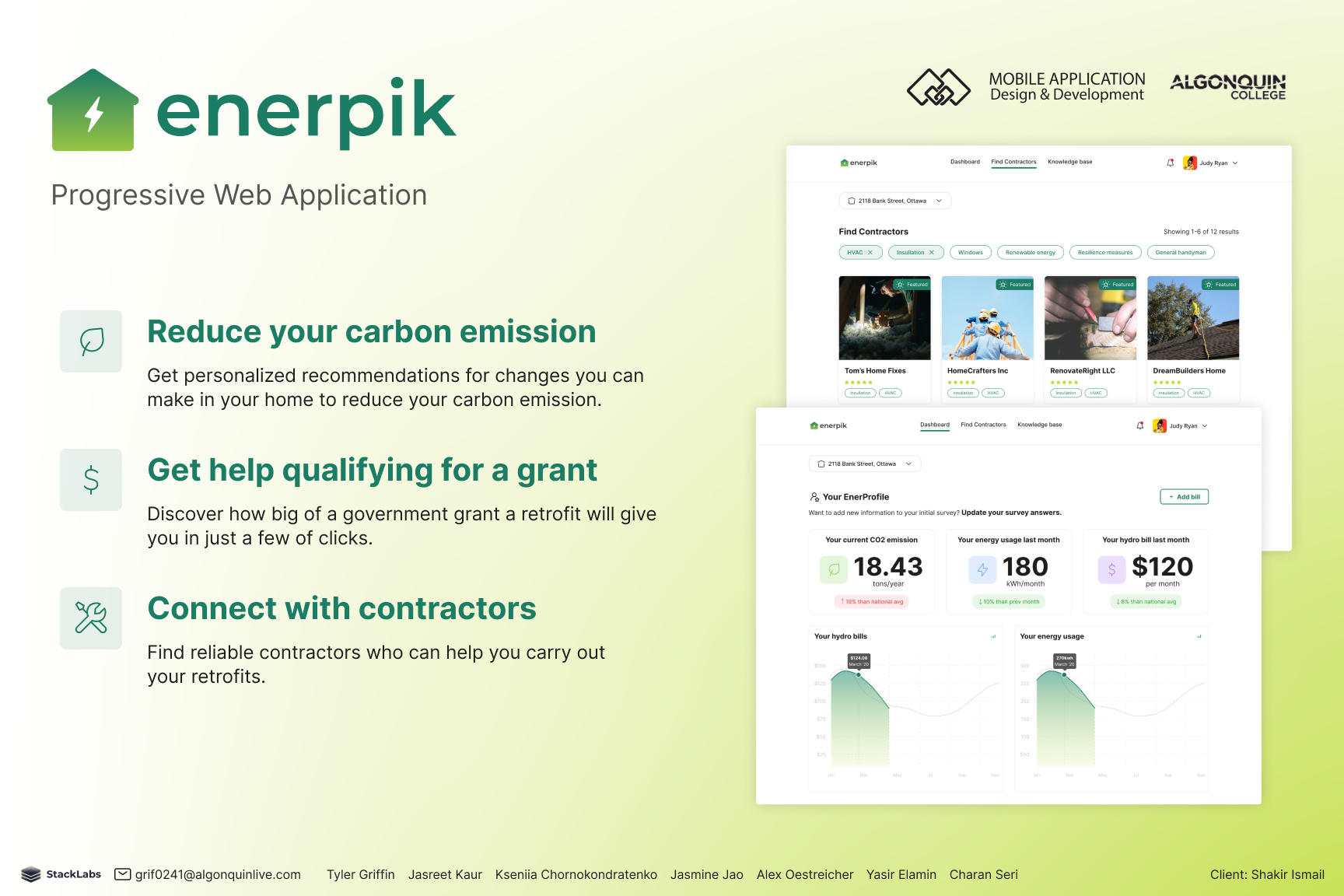 Ontario homeowners complain about the complexity and obscureness of obtaining information on how to reduce their carbon emissions and monthly energy bills via eligible retrofits and how to qualify for grant amounts provided by NRCan. Our application, EnerPik, aims to solve this by being a “one-stop-shop” for all users involved.