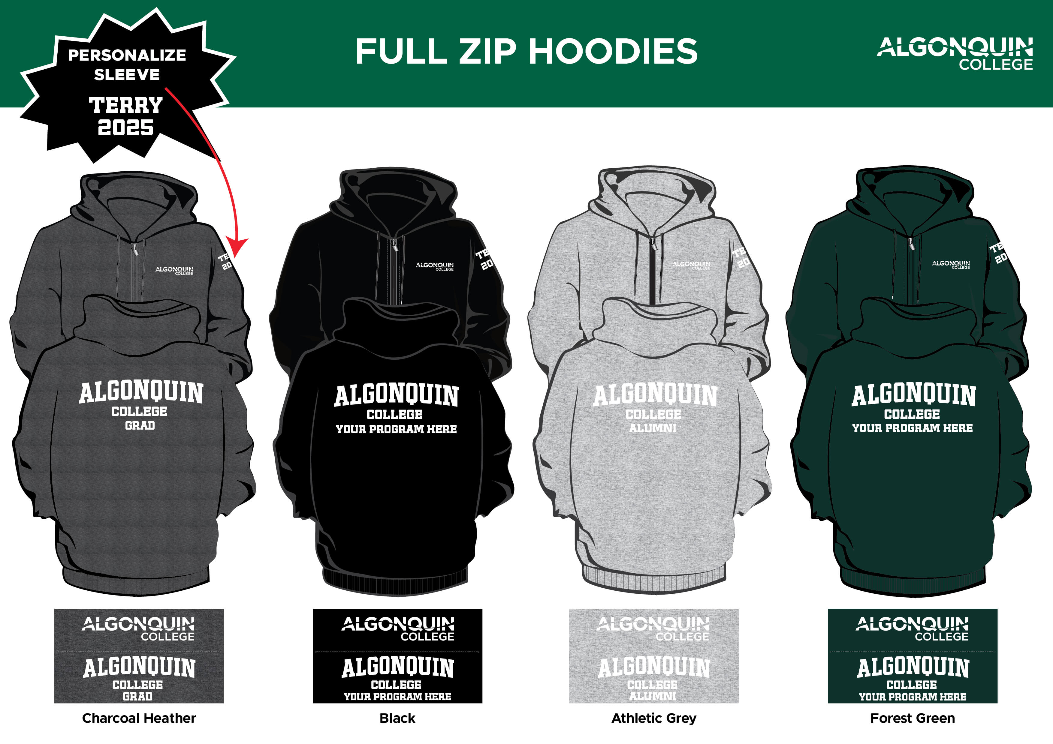 Alternatively, choose the full-zip custom hoodie! These feature Algonquin College lettering with a customizable program name on the back and two customizable lines on the sleeve for your name and graduation year.