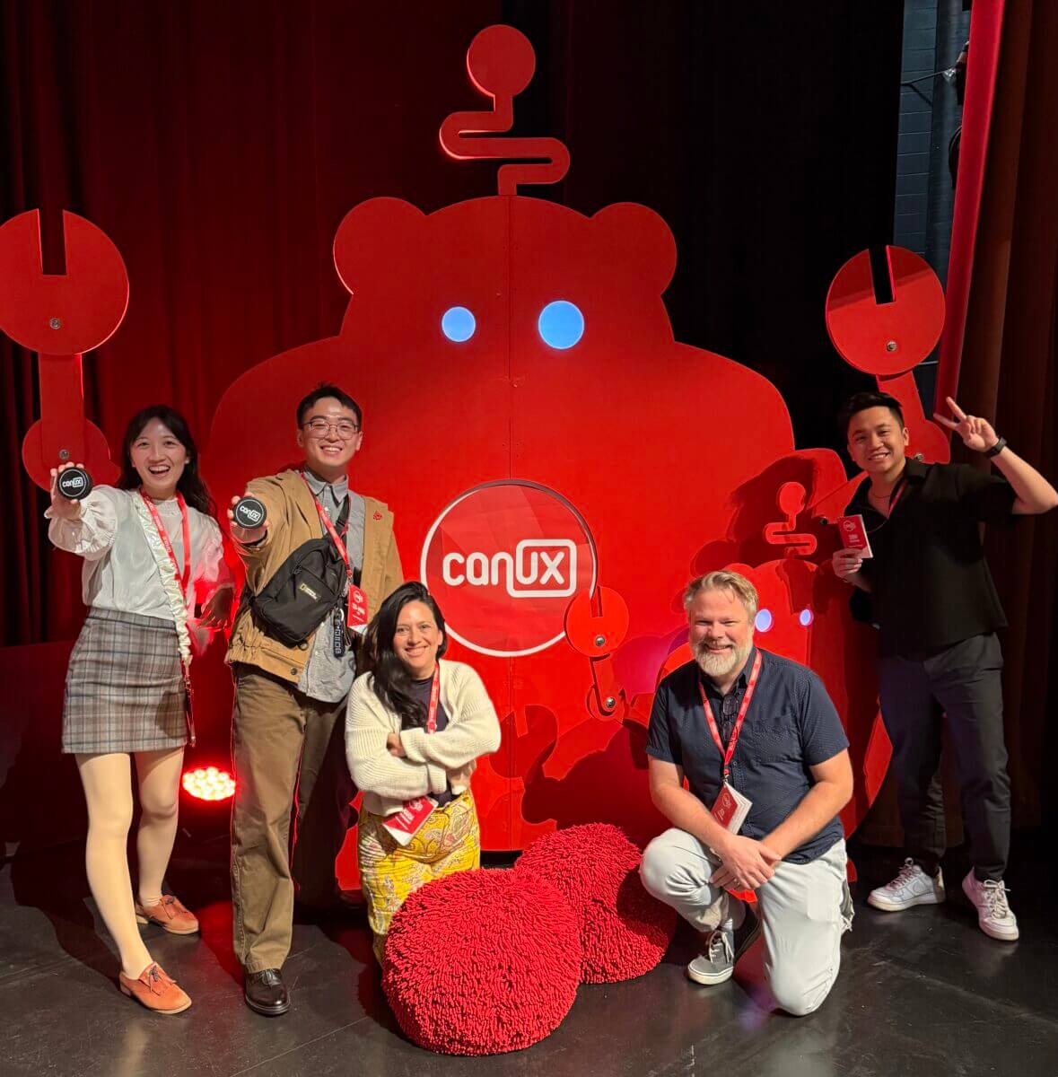 Five people pose in front of a red conference banner