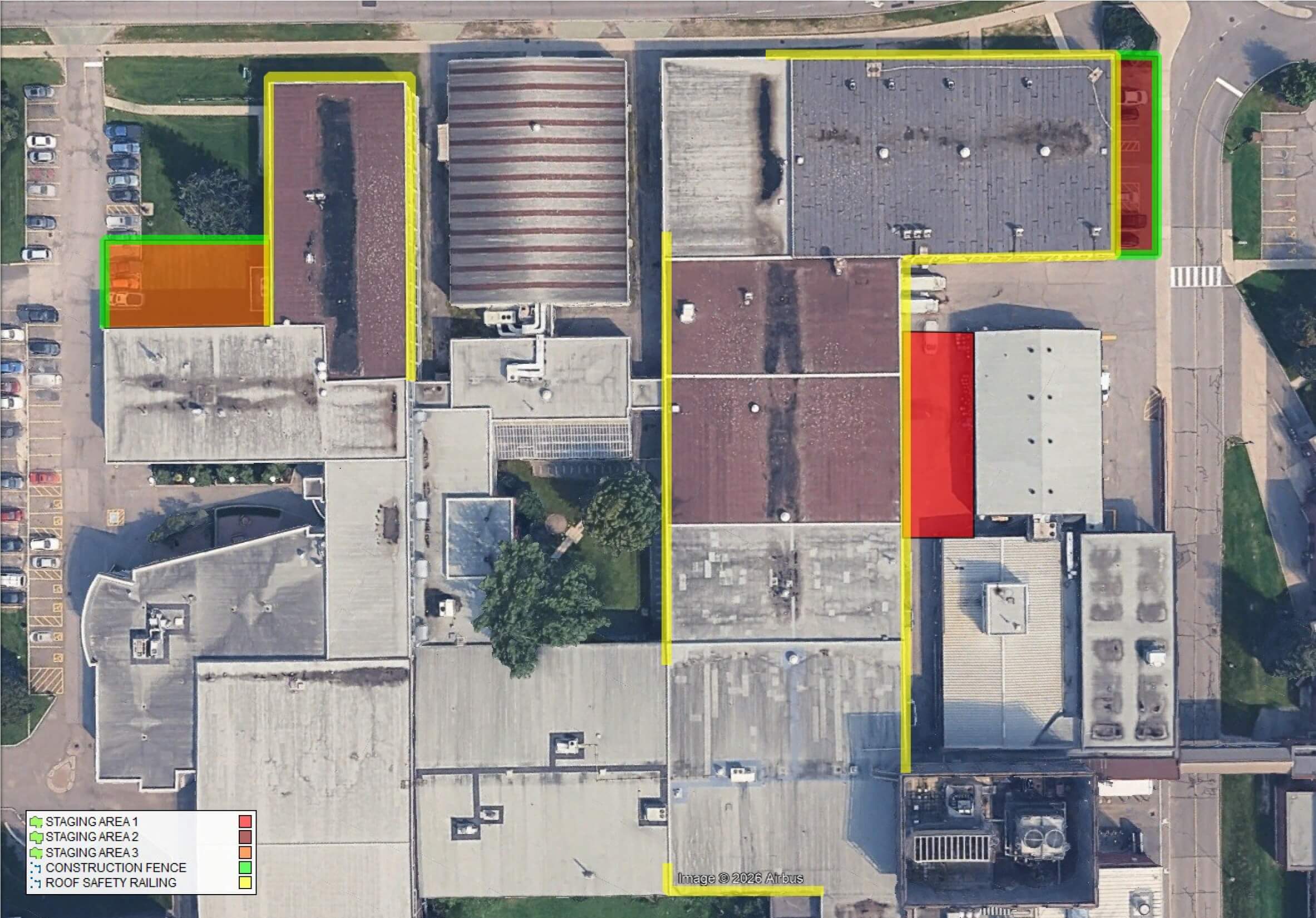 Facilities Management will be commencing work with the assigned contractor to support Building A roof replacement project (affected areas are shown on the plan below, outlined in yellow) starting Thursday, April 2, 2026 and continuing until August 2026.