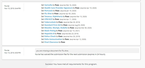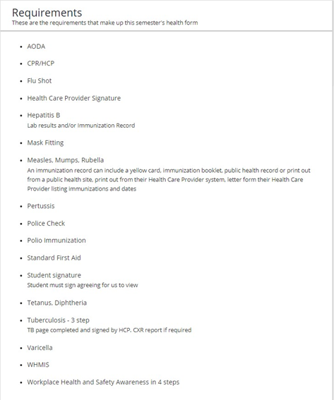 You are responsible for making sure your medical and non‐medical requirements are valid for the duration of your placement. If you are in a program with more than one placement, you will need to update any expired items prior to the placement deadline.