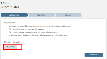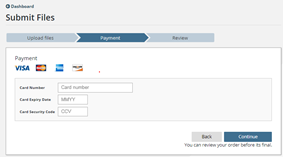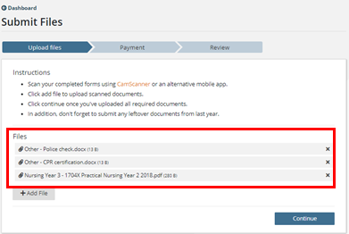 - Once you are satisfied that you have uploaded all the required files click the Continue icon in the bottom right corner to proceed to the Payment screen.