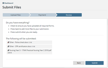 - A final review page will pop up allowing you an opportunity to review your uploaded documents to ensure that you have not missed uploading one. If you determine you have not uploaded a document you can click the Back icon and return to the upload page. If you are satisfied that you have uploaded all the necessary documents click the Submit icon to submit your documents and complete your payment process.
