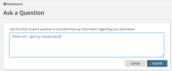 - If you wish to ask a question click on the Ask a Question icon and enter your question in the free text box. Click submit.