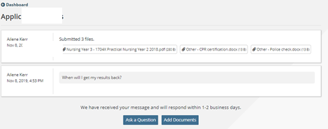 - Your question will appear in the Application Details and when a nurse responds to your question it will be located at the bottom of the Clearance screen.