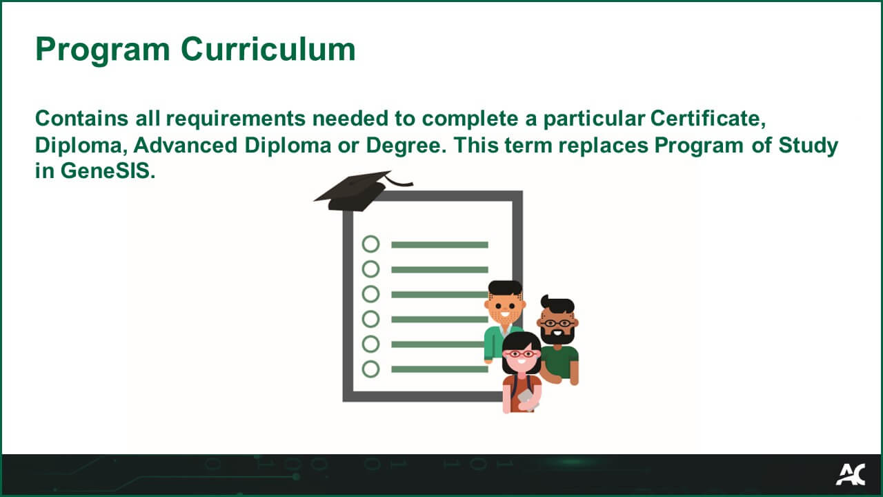 A Program Curriculum maps the requirements needed to complete a particular Certificate, Diploma, Advanced Diploma or Degree.