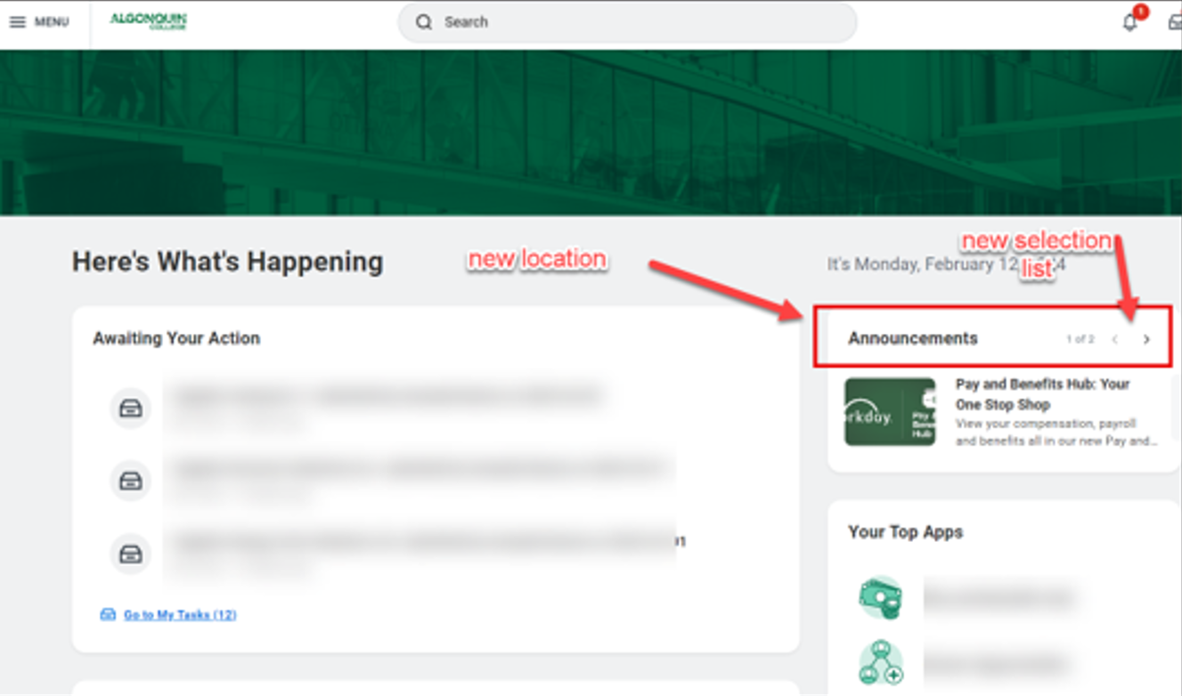 The Announcements section on the homepage has been relocated to the top right to make the important information more easily accessible. Only one announcement shows at a time, but you can click the arrow buttons to scroll through them.
